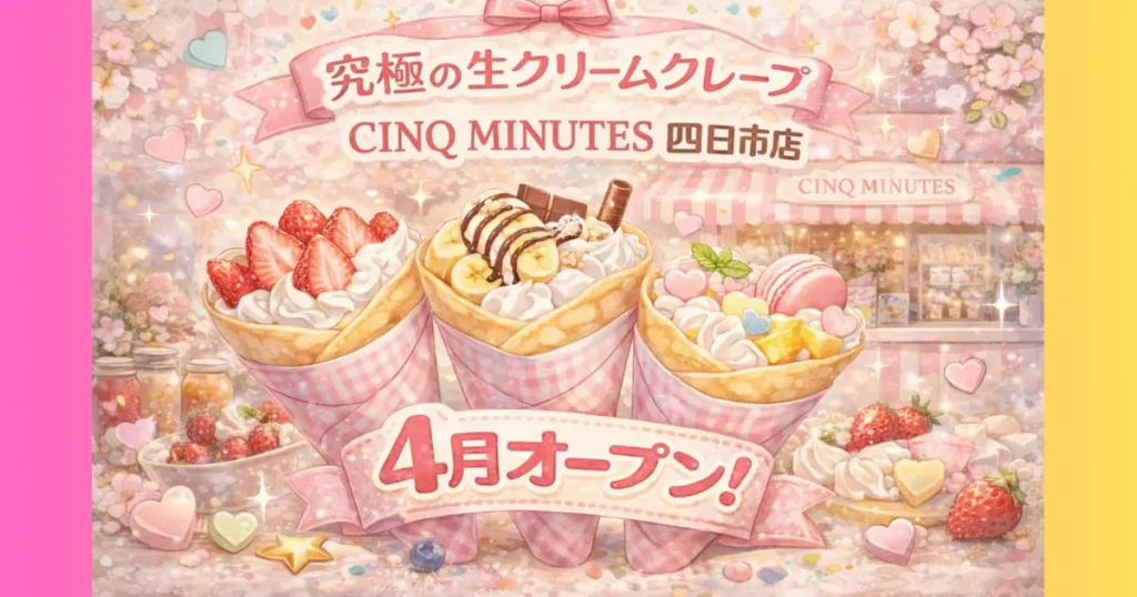 四日市笹川に『究極の生クリームクレープ CINQ MINUTES 四日市店』が2026年4月にオープンすることがわかりました。 現在オープニングスタッフ募集中! CINQ MINUTESは岡... グルメ