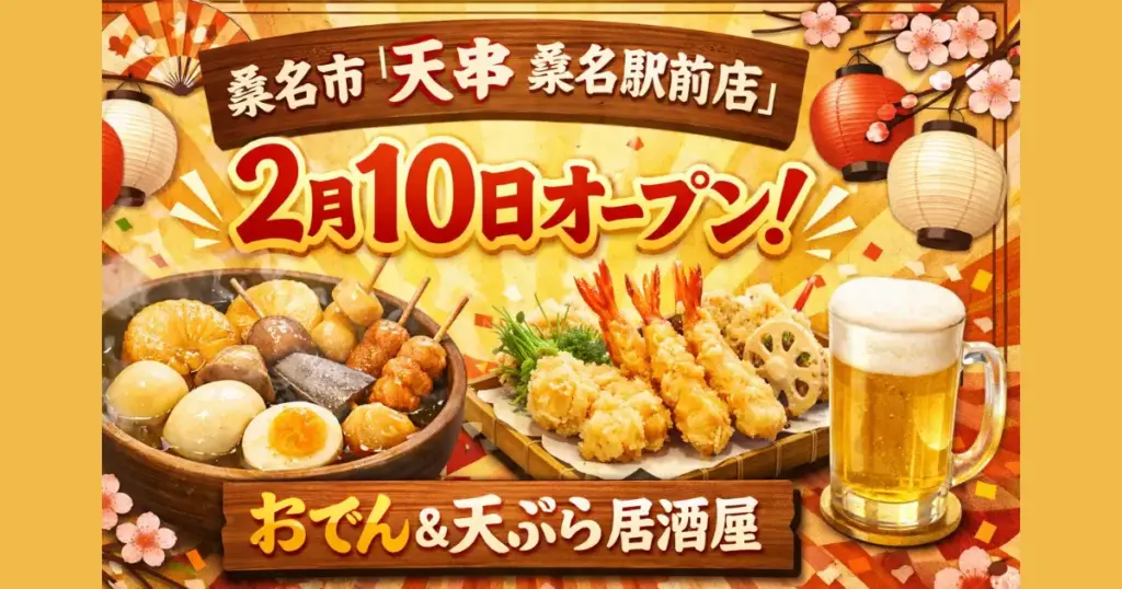 桑名駅前に天ぷらとおでん『天串 桑名駅前店』が2026年2月10日にオープンすることがわかりました! 現在、オープニングスタッフ募集中! オープンイベントで、2月10日~...